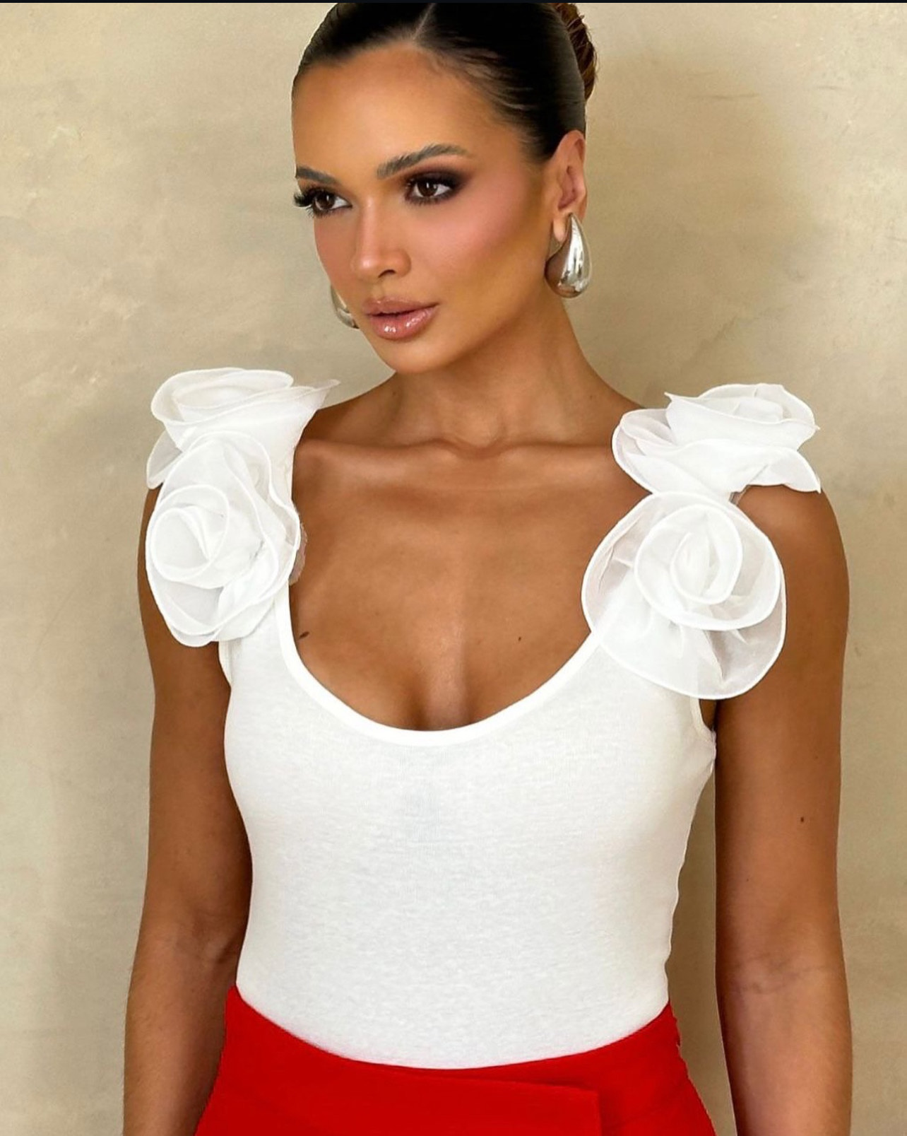 Um body delicado que combina o charme do tule com a beleza das flores aplicadas, criando um visual romântico e atemporal. Perfeito para ocasiões especiais ou para transformar qualquer look em algo inesquecível.
