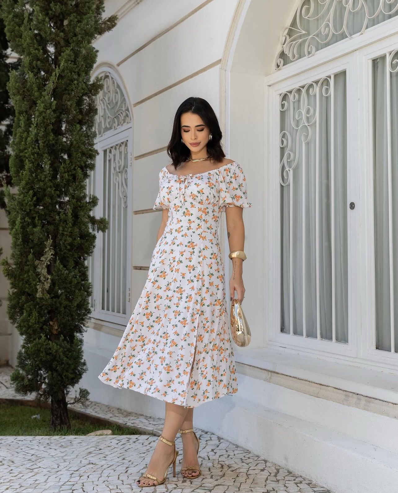 Vestido romântico e cheio de charme, com caimento leve e estampa encantadora, servindo para qualquer ocasião do dia a dia.